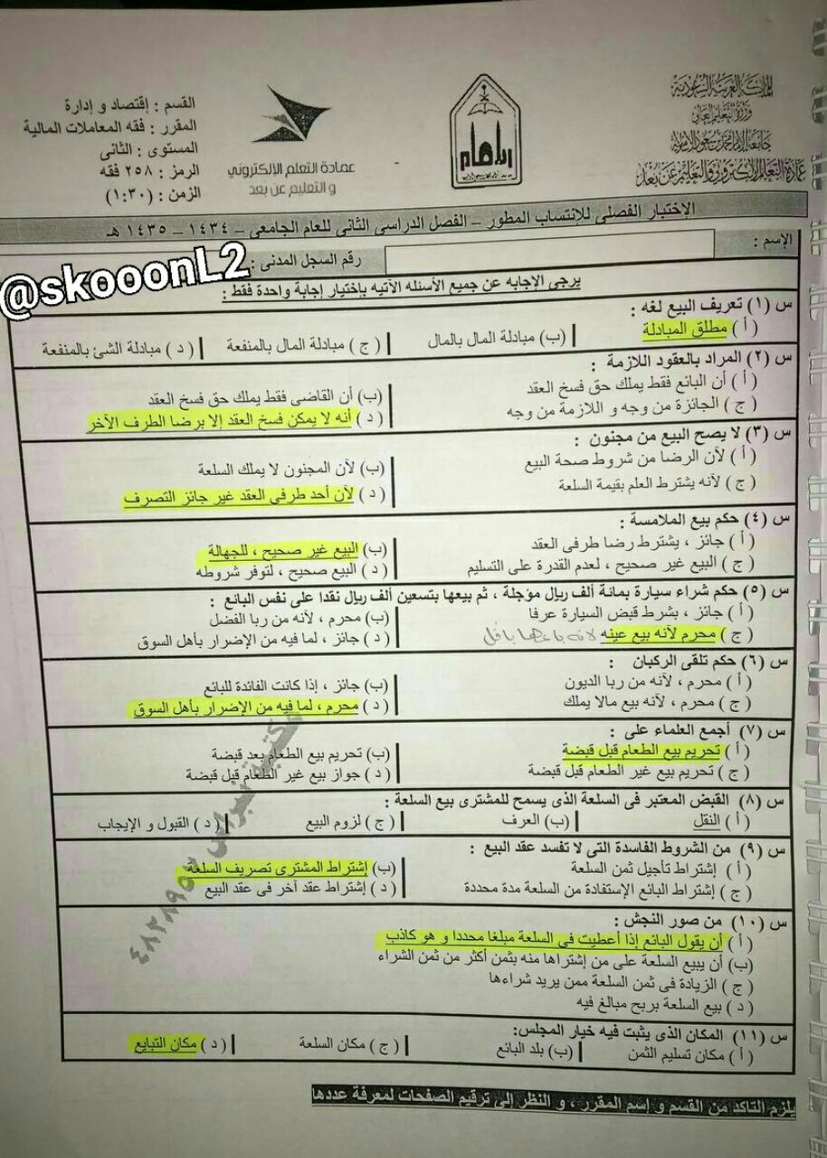 اسئلة فقه المعاملات المالية فقه 258 الفصل الثاني 1438هـ جامعة الامام فقه المعاملات المالية فقه258 جامعة الامام محمد بن سعود الاسلامية