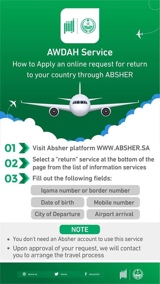 Want To Return To Home Countries From Saudi Arabia Apply For Awdah Service In Absher Procedure Saudi Arabia Arab Local